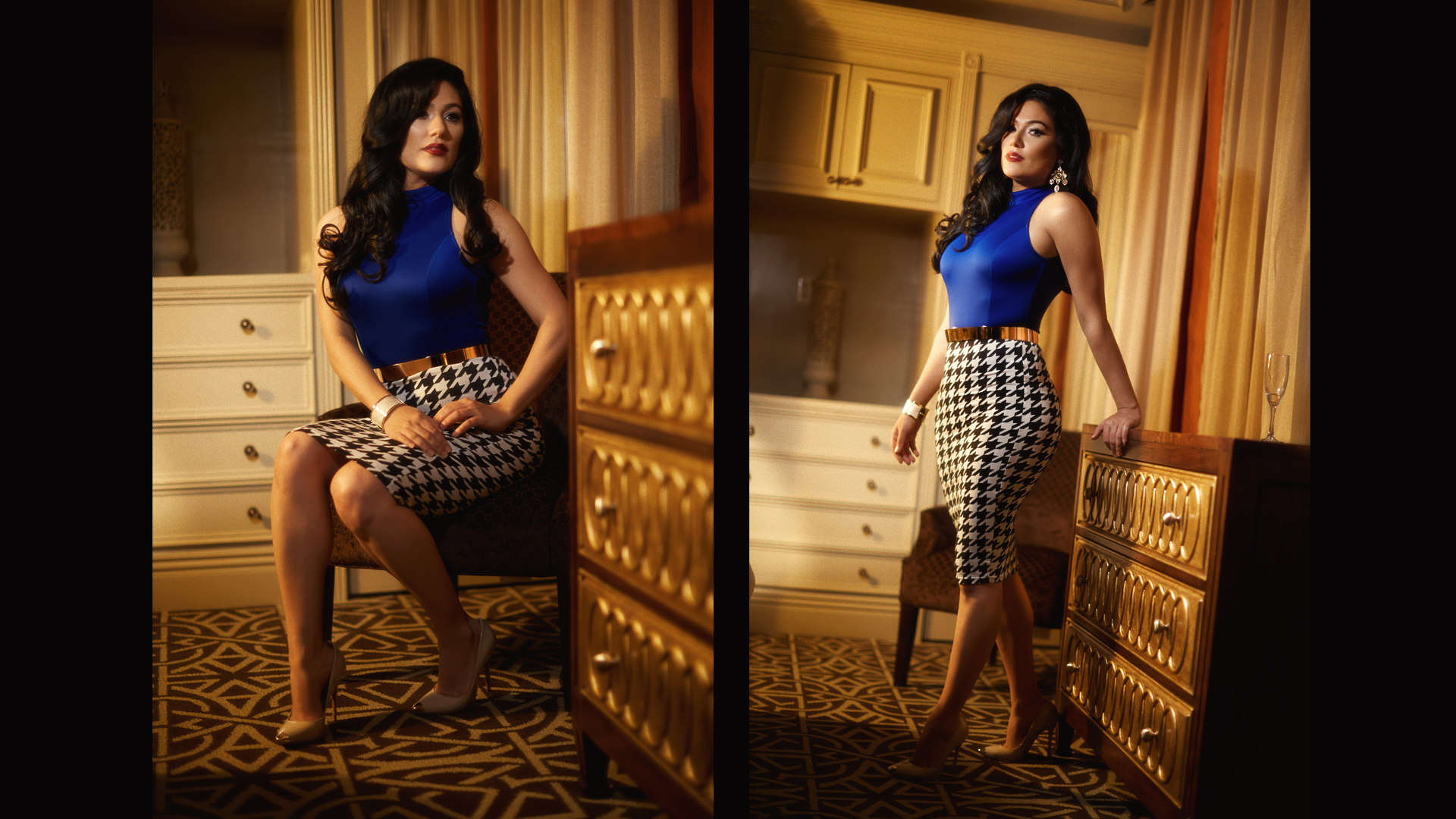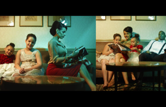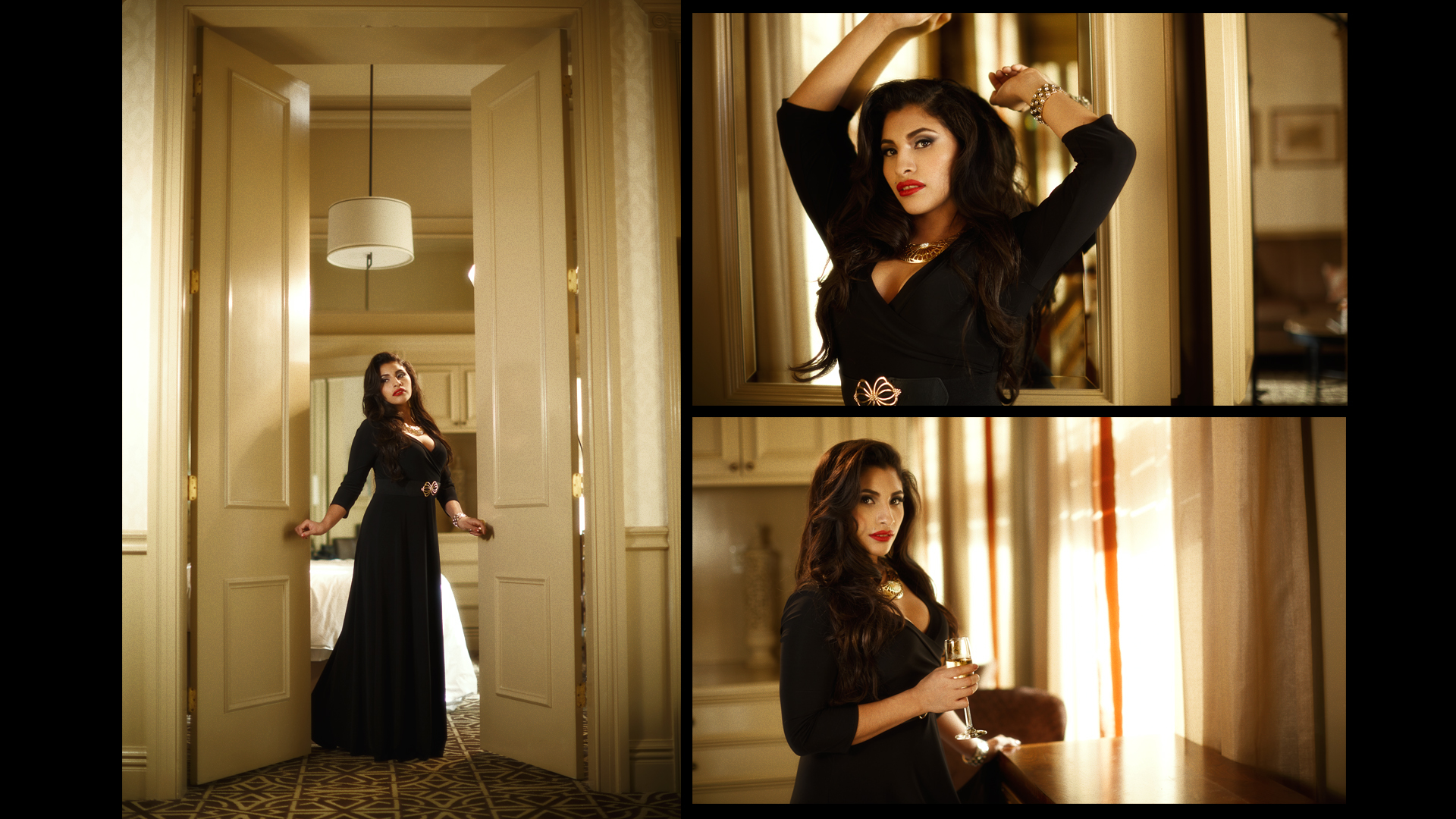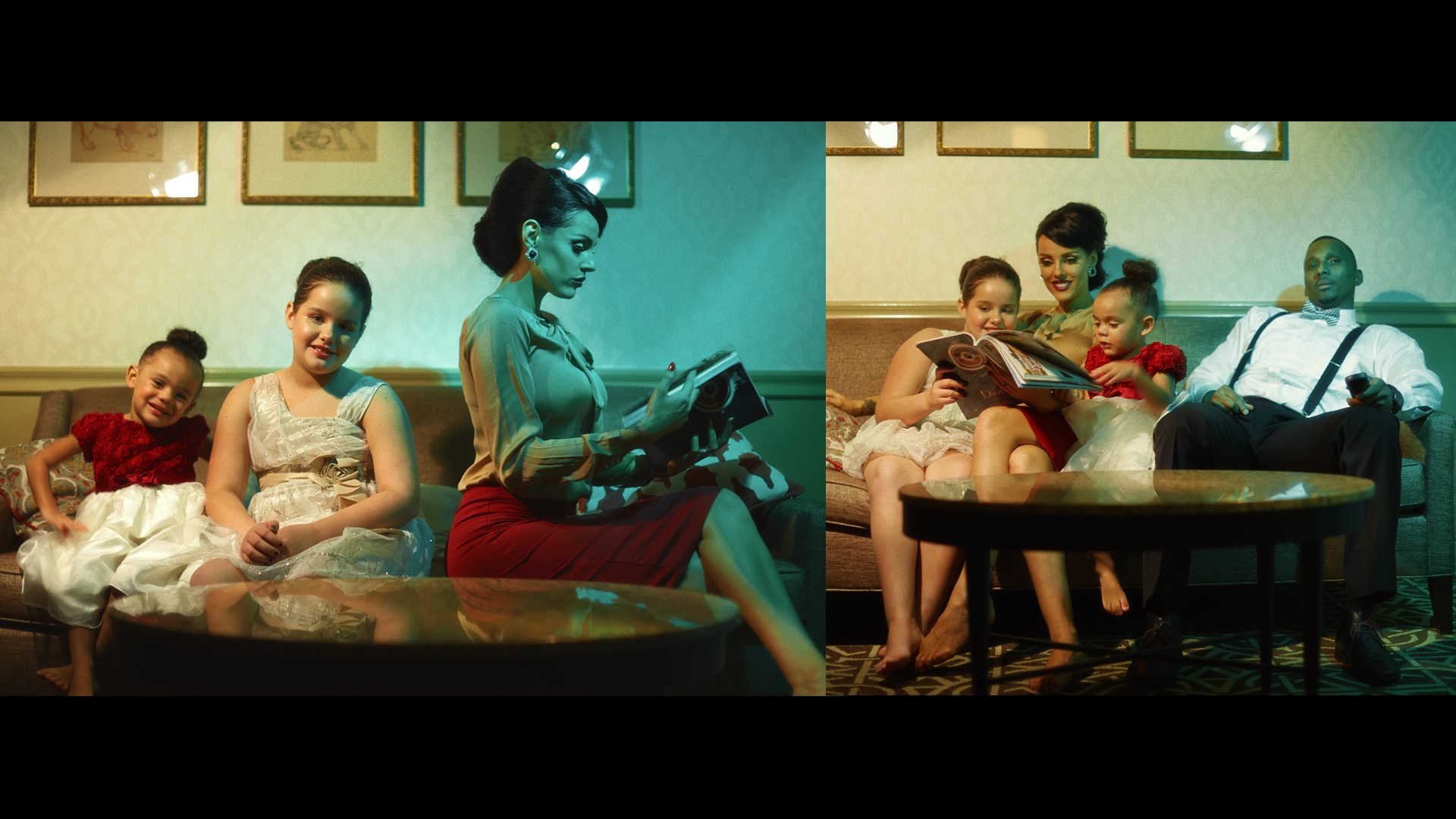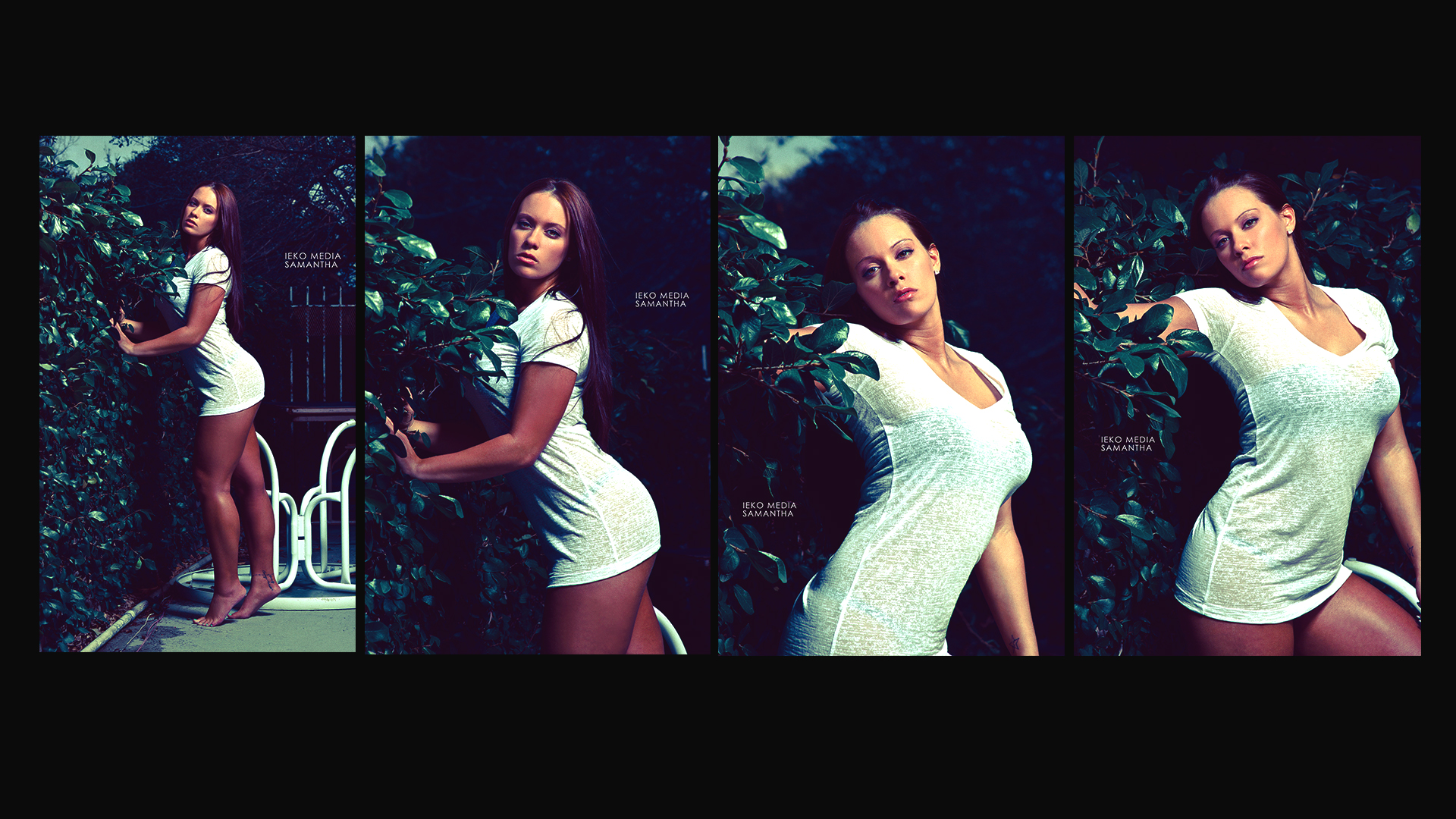 As a DP/Photographer/Production Artist I lite each set to give a different feel for the clients using continuous lighting, I directed them in each set to achieve the look we were going for. In the video I only stabilized it a bit, color corrected, added grain, and removed any exposed private parts from showing in the video.